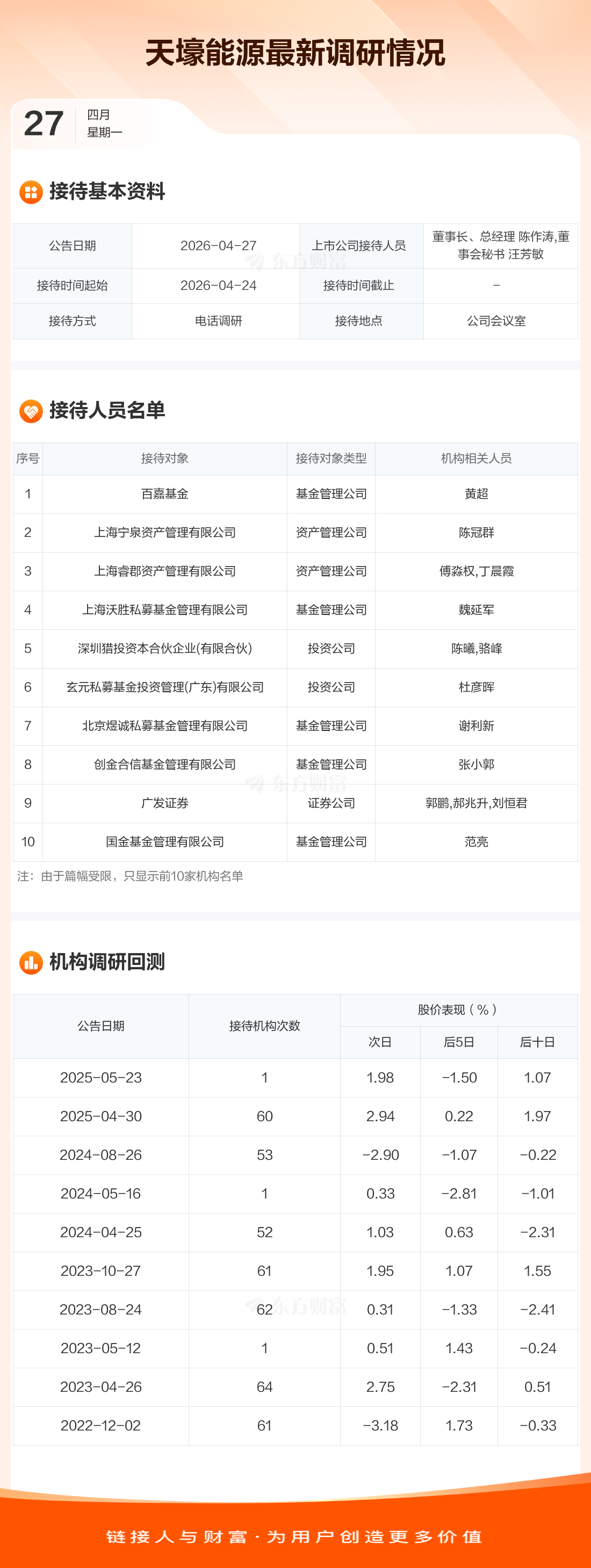 天壕能源4月27日公告称,4月24日接待百嘉基金等14家机构调研。接待人员包括董事长、总经理 陈作涛,董事会秘书 汪芳敏。