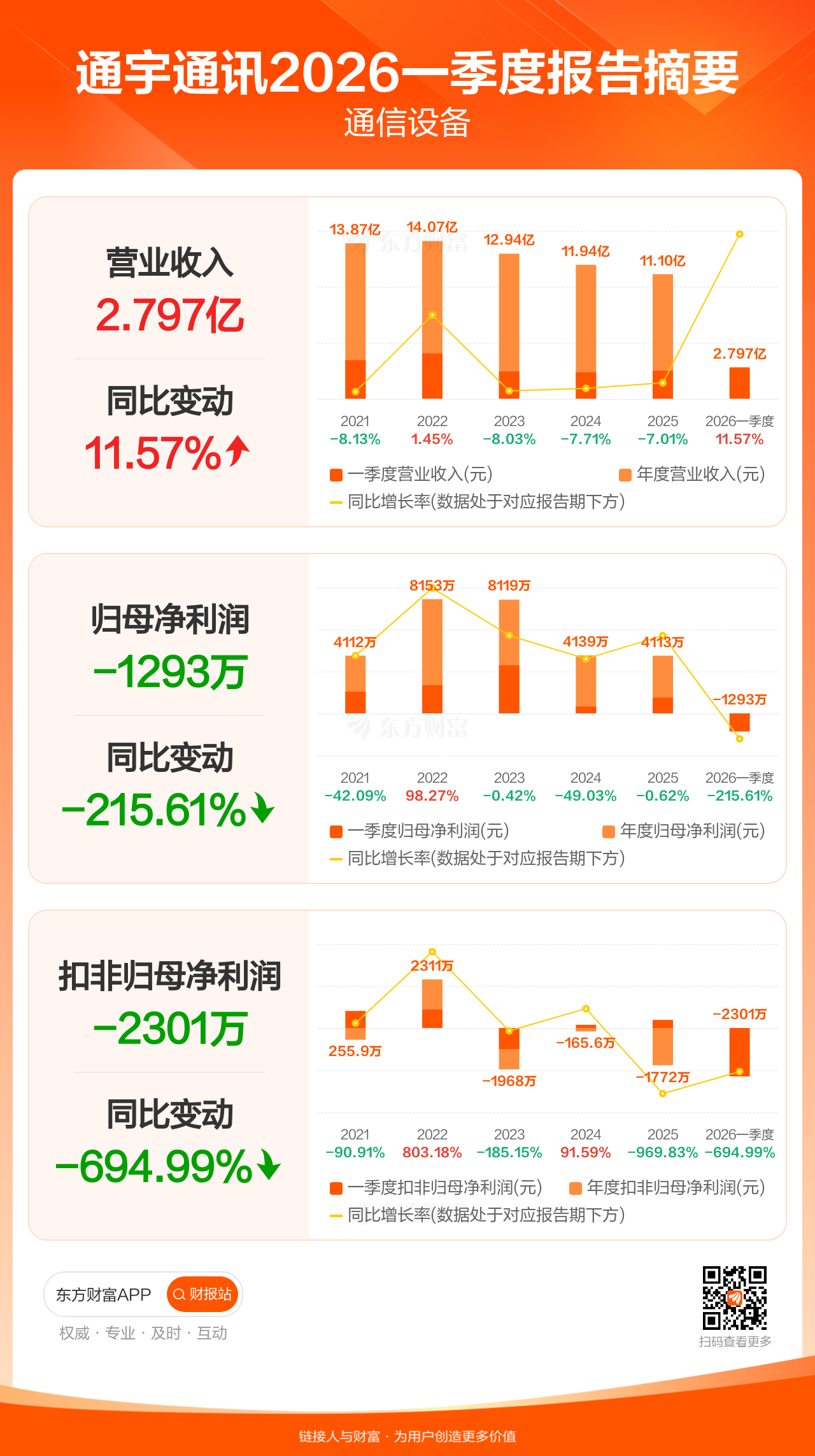 通宇通讯4月28日发布2026年一季报显示,公司一季度实现营业收入2.80亿元,同比增长11.57%;归母净利润-1292.72万元;扣非归母净利润-2301.48万元。