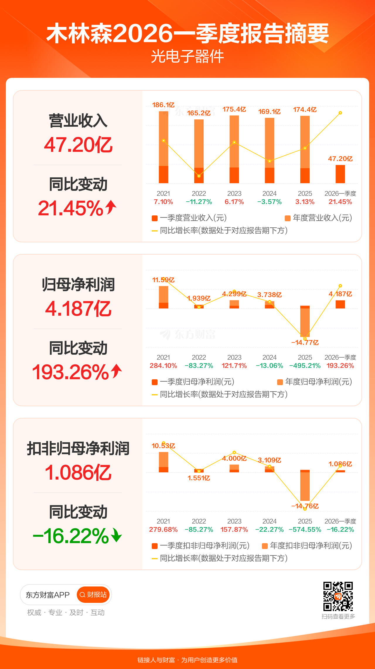 木林森4月28日发布2026年一季报显示,公司一季度实现营业收入47.20亿元,同比增长21.45%;归母净利润4.19亿元,同比增长193.26%;扣非归母净利润1.09亿元,同比下滑16.22%。