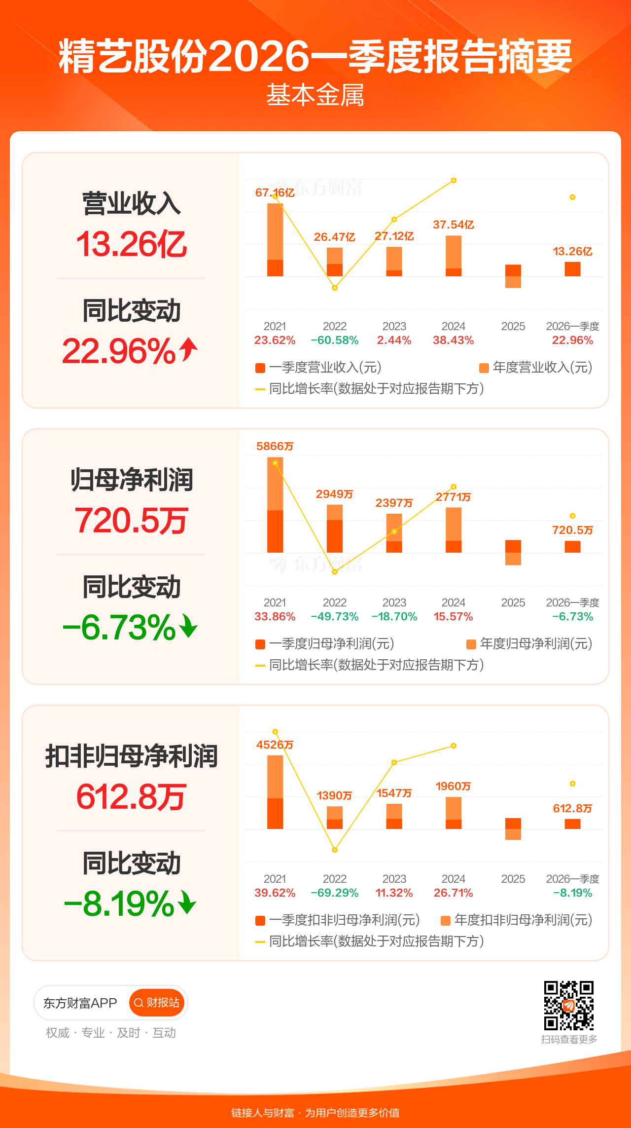 精艺股份4月28日发布2026年一季报显示,公司一季度实现营业收入13.26亿元,同比增长22.96%;归母净利润720.47万元,同比下滑6.73%;扣非归母净利润612.78万元,同比下滑8.19%。