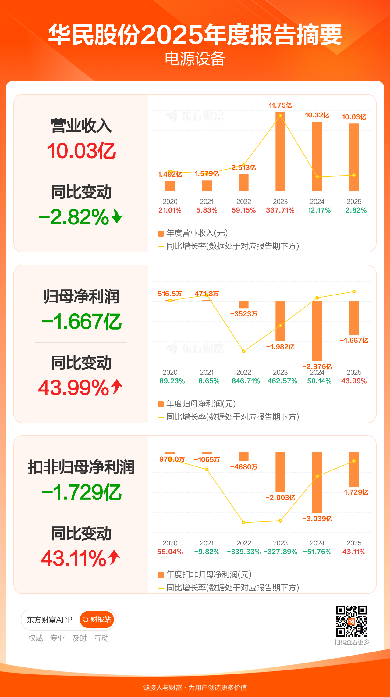 华民股份4月28日发布2025年年报显示,公司全年实现营业收入10.03亿元,同比下滑2.82%;归母净利润-1.67亿元;扣非归母净利润-1.73亿元。