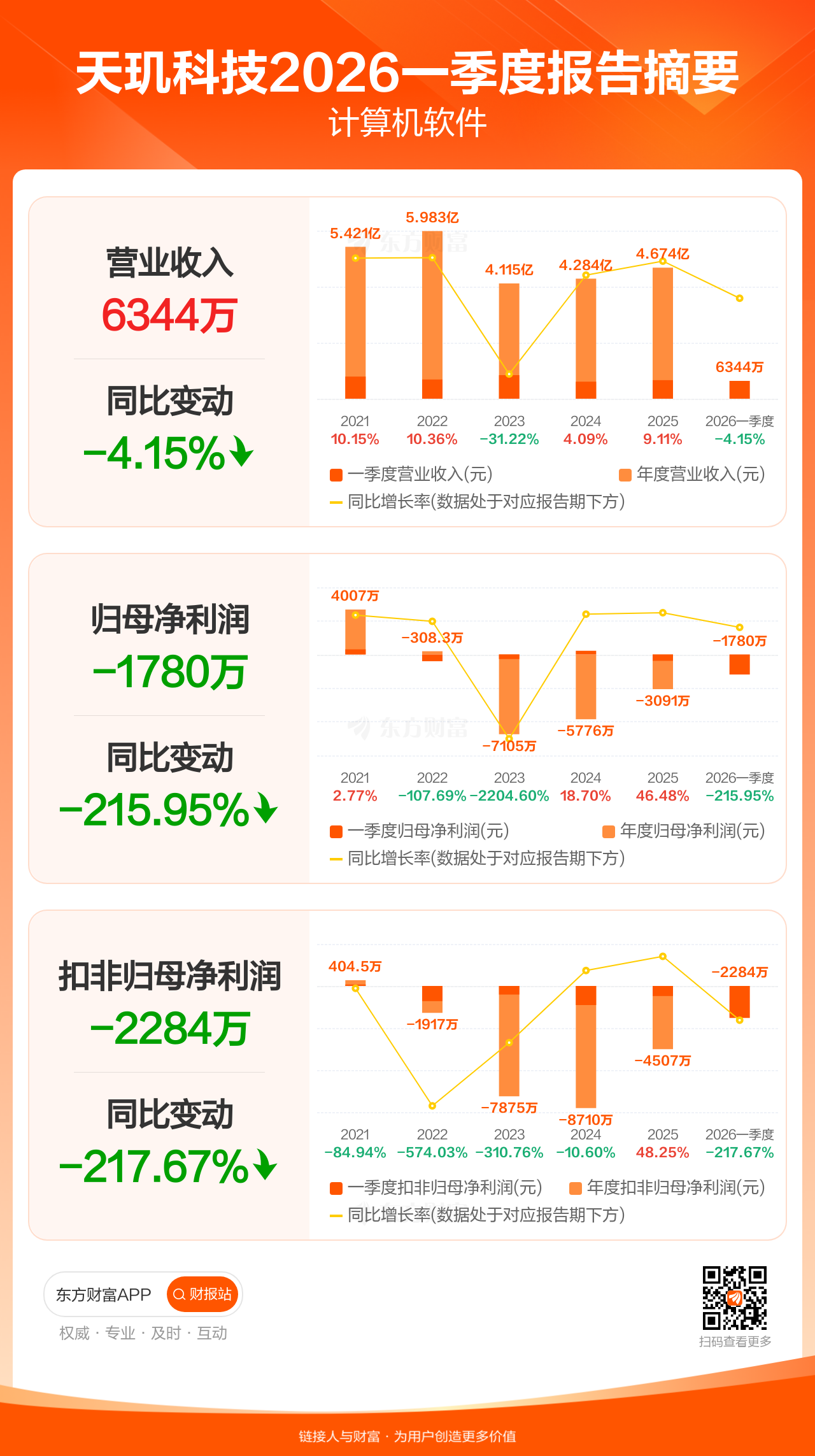 天玑科技4月28日发布2026年一季报显示,公司一季度实现营业收入6343.51万元,同比下滑4.15%;归母净利润-1780.07万元;扣非归母净利润-2283.89万元。