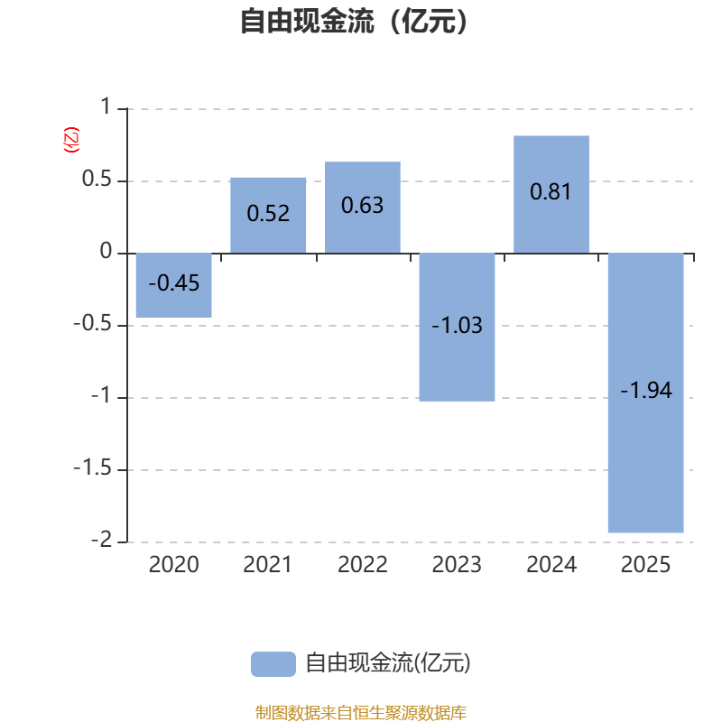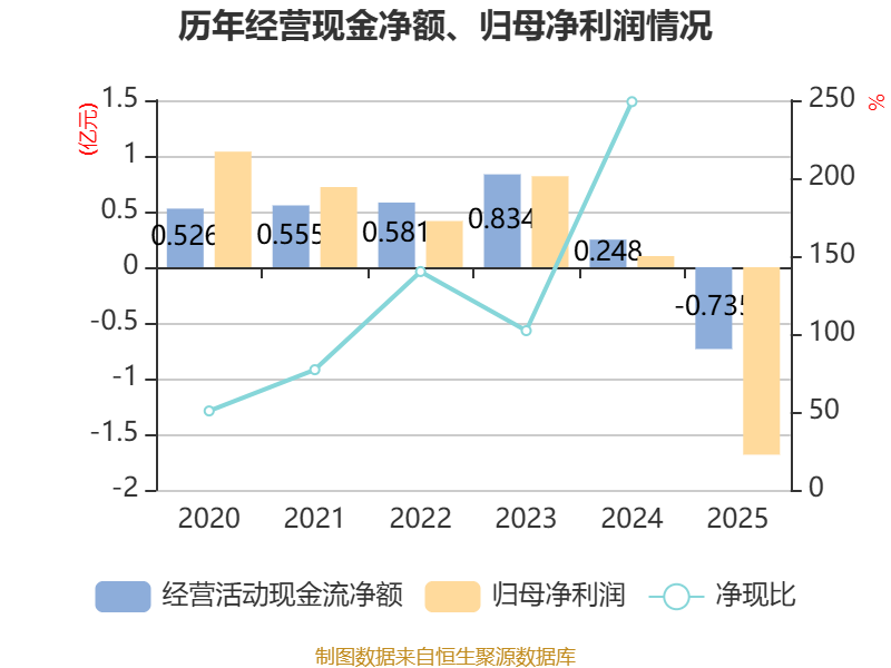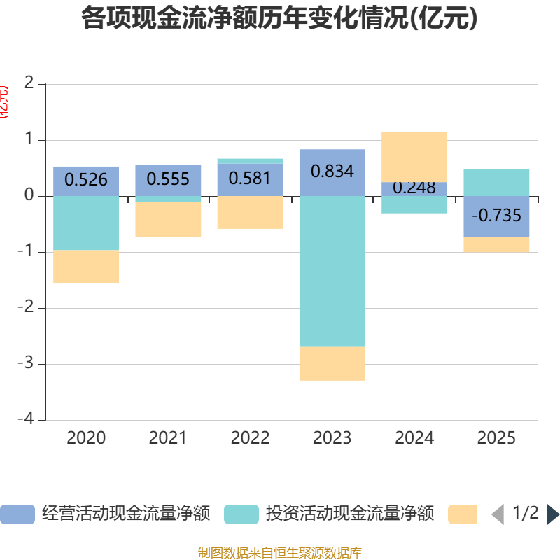 截至2025年,公司经营活动现金流净额为-7346.43万元,同比减少9827.99万元;筹资活动现金流净额-2678.62万元,同比减少1.16亿元;投资活动现金流净额4825.05万元,上年同期为-3088.8万元。