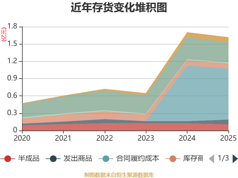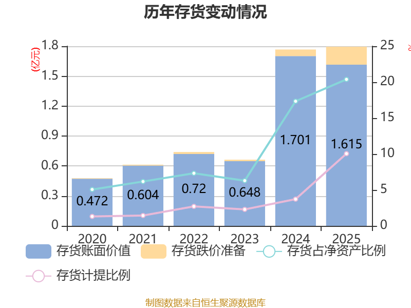 从存货变动来看,截至2025年末,公司存货账面价值为1.62亿元,占净资产的20.38%,较上年末减少855.92万元。其中,存货跌价准备为1804.68万元,计提比例为10.05%。