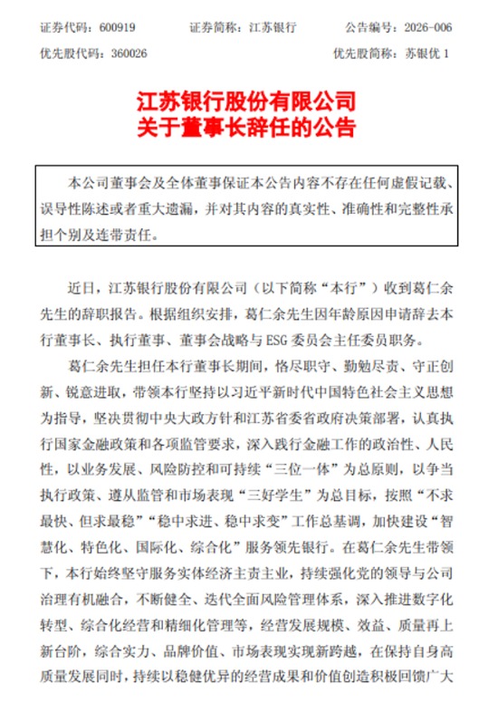 江苏银行在公告中对葛仁余先生在该行任职期间所作出的卓越贡献致以由衷的敬意和诚挚的感谢。公告称,葛仁余先生担任本行董事长期间,恪尽职守、勤勉尽责、守正创新、锐意进取,带领本行坚持以习近平新时代中国特色社会主义思想为指导,坚决贯彻中央大政方针和江苏省委省政府决策部署,认真执行国家金融政策和各项监管要求,深入践行金融工作的政治性、人民性,以业务发展、风险防控和可持续“三位一体”为总原则,以争当执行政策、遵从监管和市场表现“三好学生”为总目标,按照“不求最快、但求最稳”“稳中求进、稳中求变”工作总基调,加快建设“智慧化、特色化、国际化、综合化”服务领先银行。