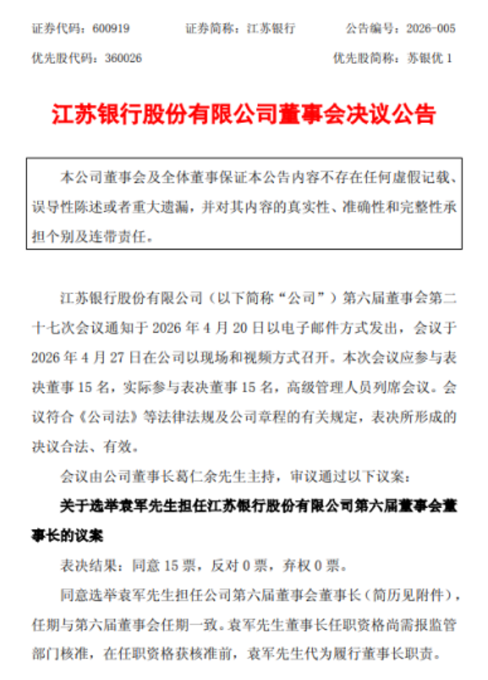 公告显示,江苏银行第六届董事会第二十七次会议已审议通过上述选举事项。根据规定,袁军的董事长任职资格尚需报国家金融监督管理总局核准。在任职资格获得核准前,袁军将代为履行董事长职责。