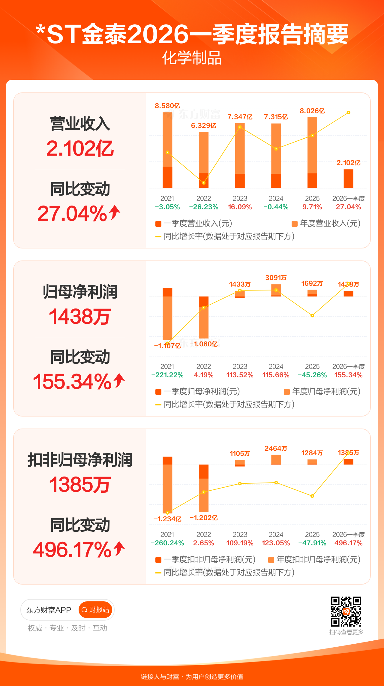 *ST金泰4月28日发布2026年一季报显示,公司一季度实现营业收入2.10亿元,同比增长27.04%;归母净利润1438.33万元,同比增长155.34%;扣非归母净利润1384.59万元,同比增长496.17%。