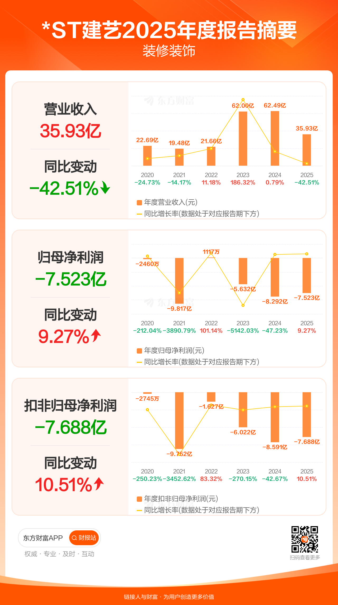 *ST建艺4月28日发布2025年年报显示,公司全年实现营业收入35.93亿元,同比下滑42.51%;归母净利润-7.52亿元;扣非归母净利润-7.69亿元。