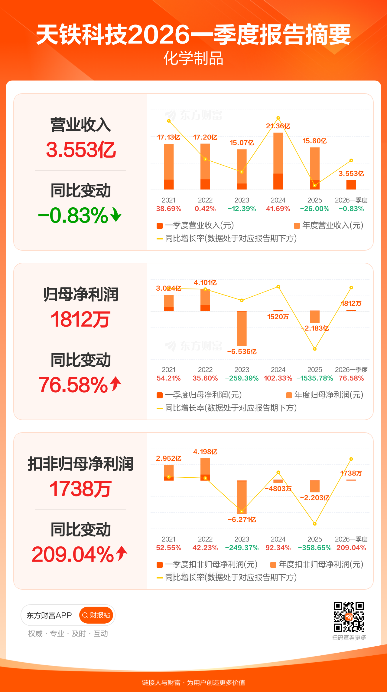 天铁科技4月28日发布2026年一季报显示,公司一季度实现营业收入3.55亿元,同比下滑0.83%;归母净利润1811.62万元,同比增长76.58%;扣非归母净利润1738.33万元,同比增长209.04%。