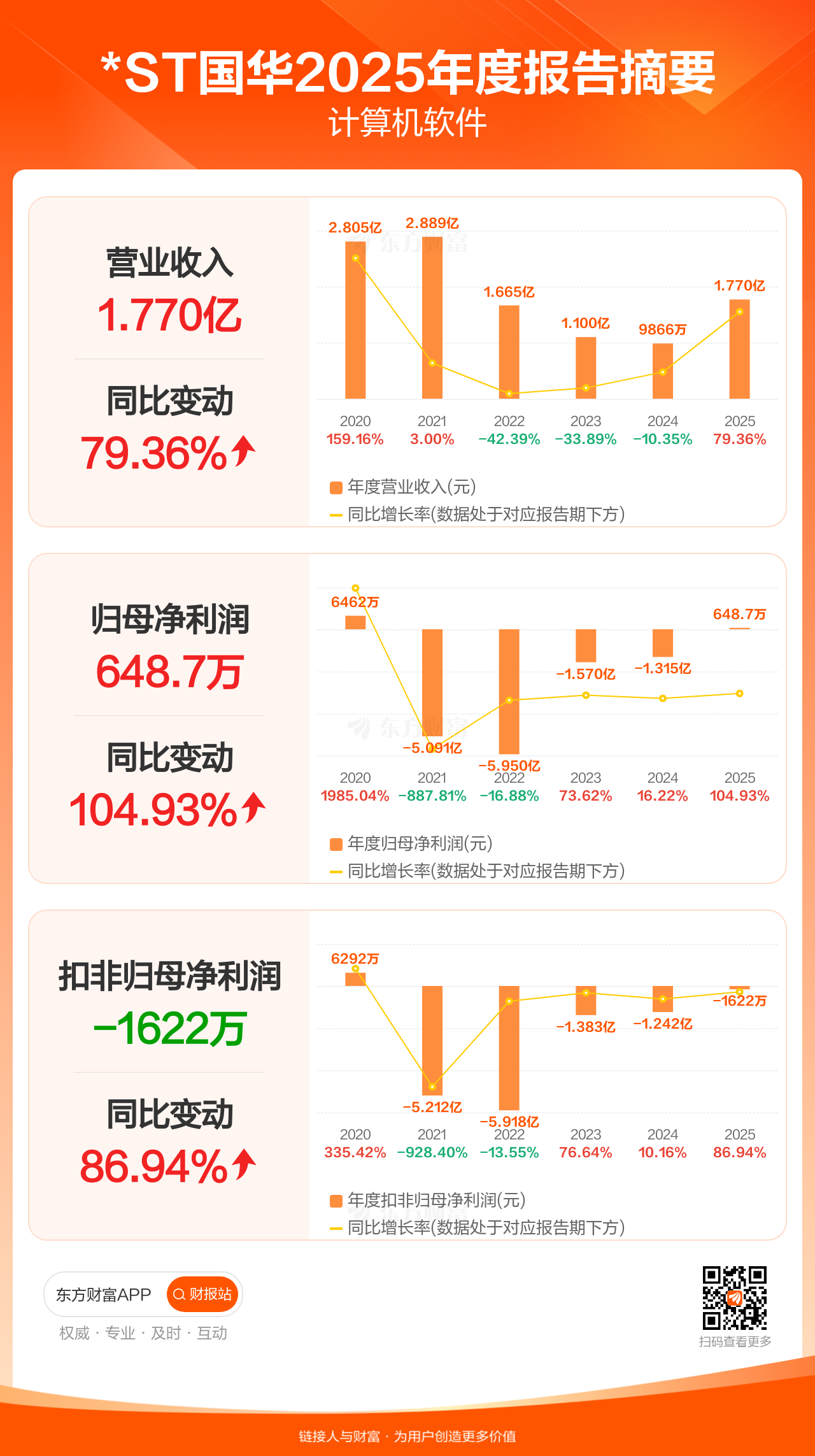*ST国华4月28日发布2025年年报显示,公司全年实现营业收入1.77亿元,同比增长79.36%;归母净利润648.72万元,同比增长104.93%;扣非归母净利润-1622.39万元。