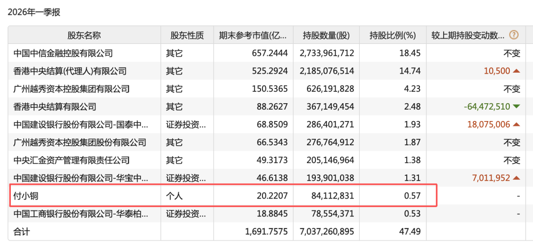 从持仓细节看,付小铜并未出现在2025年年报十大股东名单,属于一季度新进。以3月31日中信证券收盘价每股24.04元计算,付小铜持有的中信证券市值约为20.22亿元。