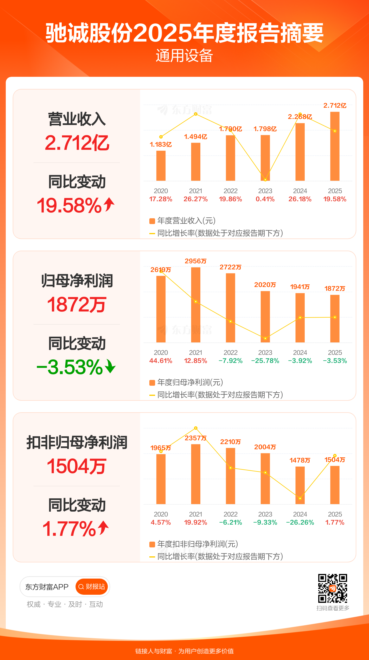 驰诚股份4月27日发布2025年年报显示,公司全年实现营业收入2.71亿元,同比增长19.58%;归母净利润1872.42万元,同比下滑3.53%;扣非归母净利润1504.14万元,同比增长1.77%。