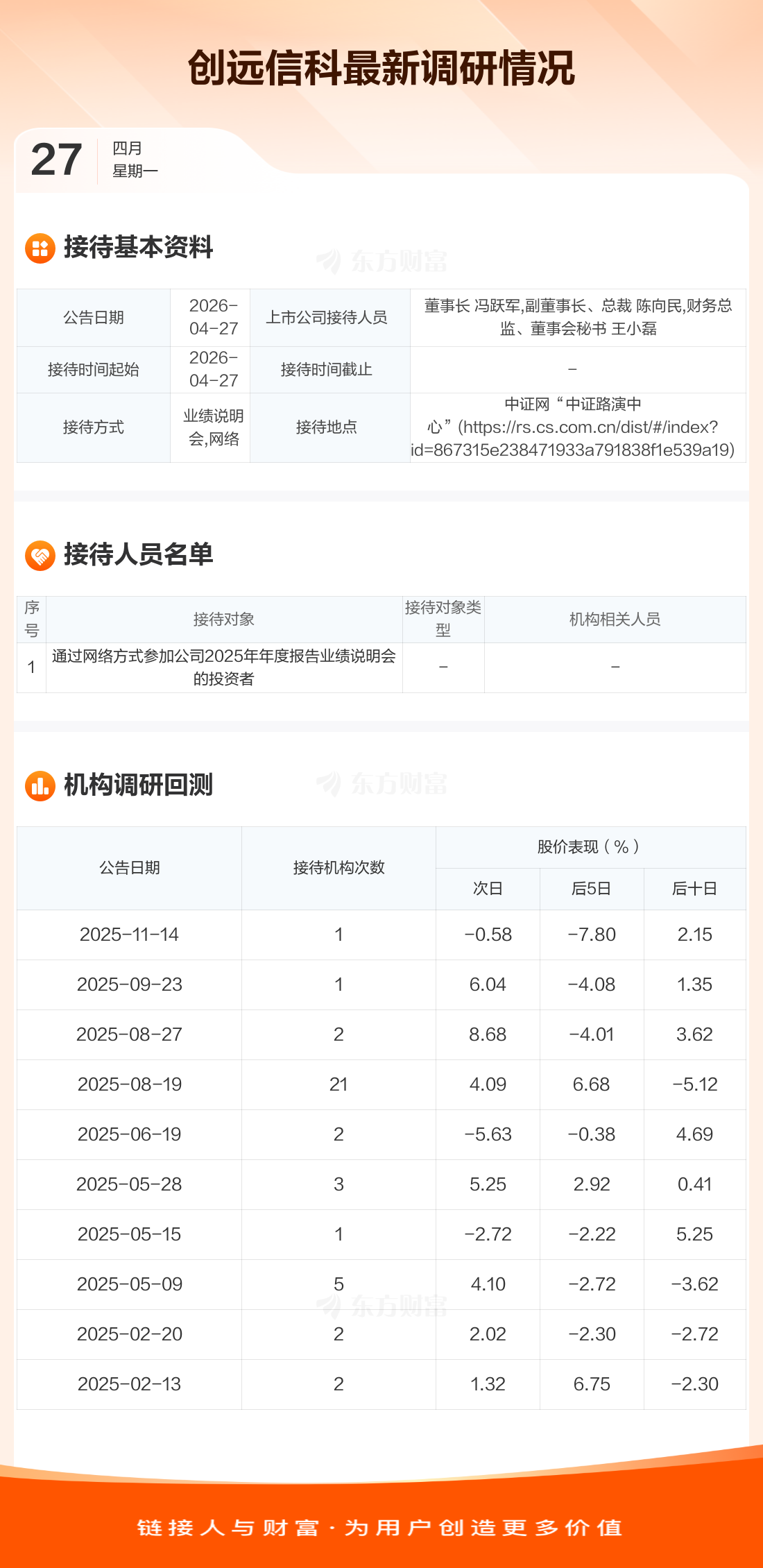 创远信科4月27日公告称,4月27日接待通过网络方式参加公司2025年年度报告业绩说明会的投资者调研。接待人员包括董事长 冯跃军,副董事长、总裁 陈向民,财务总监、董事会秘书 王小磊。