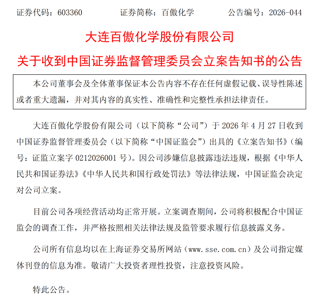 4月27日晚间,百傲化学(603360)公告称,公司收到中国证监会出具的《立案告知书》。因公司涉嫌信息披露违法违规,根据有关法律法规,中国证监会决定对公司立案调查。