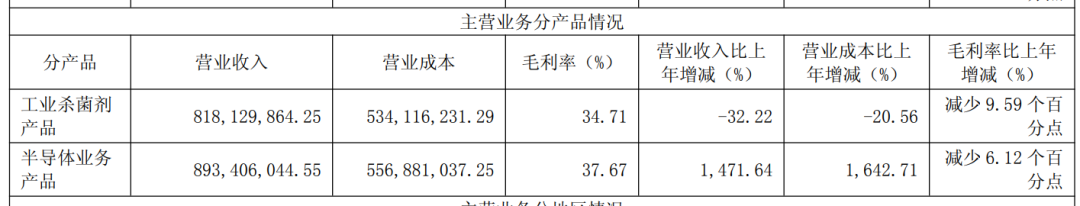 从业务数据来看,2025年公司半导体业务实现营业收入8.93亿元,看似较2024年暴涨1471.64%,实则可比性极低——因2024年数据仅包含12月数据。但不可忽视的是,半导体业务收入规模已经超过工业杀菌剂业务,成为公司第一大业务板块。