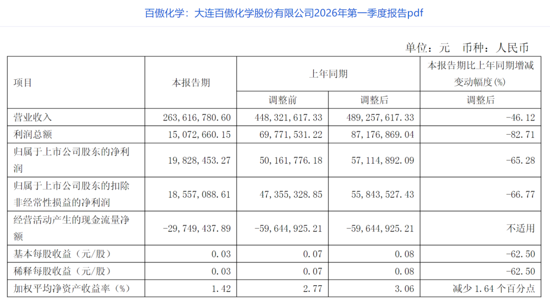 2026年一季度,百傲化学实现营业收入2.64亿元,同比下降46.12%;归属于上市公司股东的净利润1982.85万元,同比下降65.28%。
