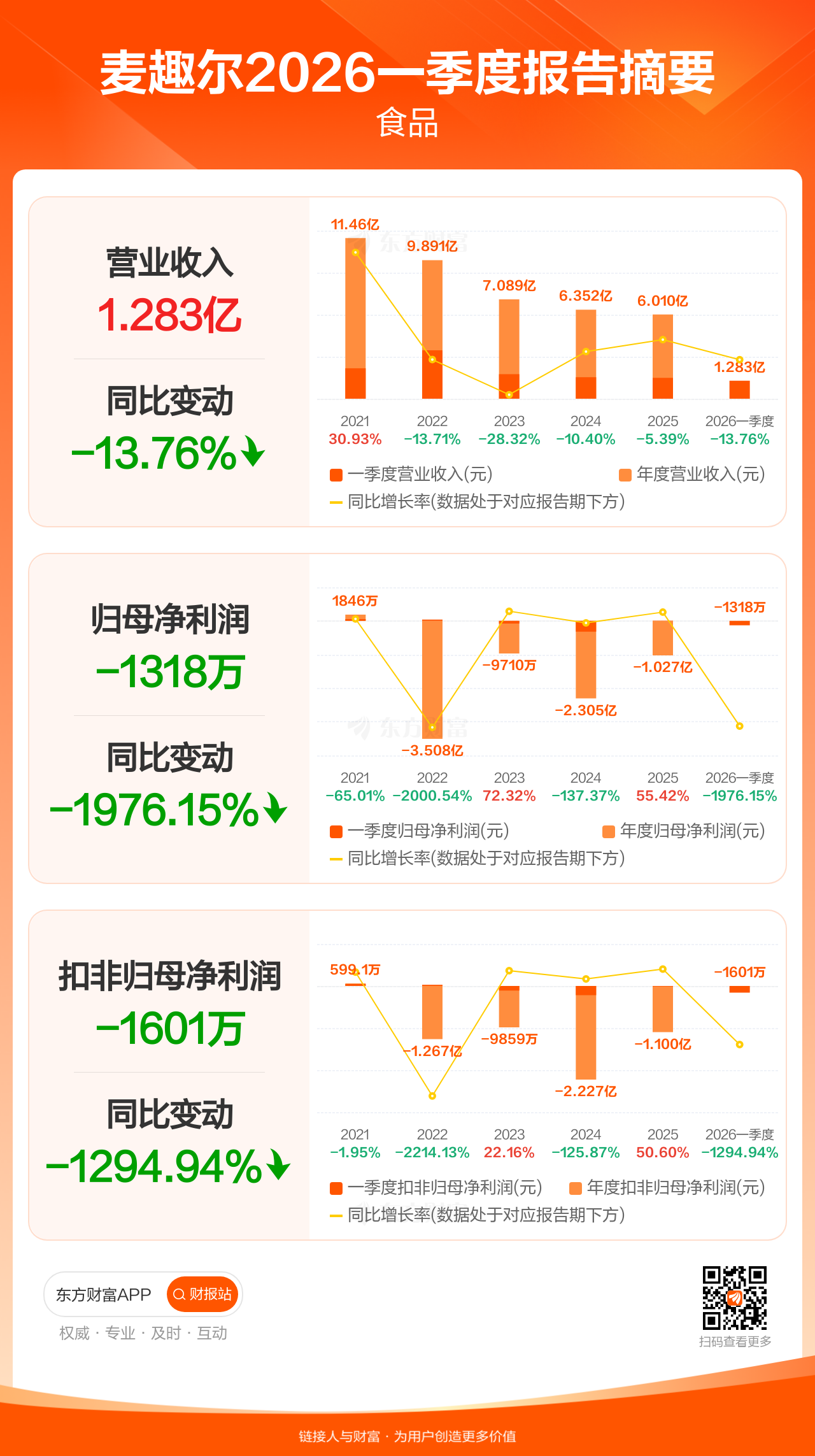 麦趣尔4月28日发布2026年一季报显示,公司一季度实现营业收入1.28亿元,同比下滑13.76%;归母净利润-1318.07万元;扣非归母净利润-1600.74万元。