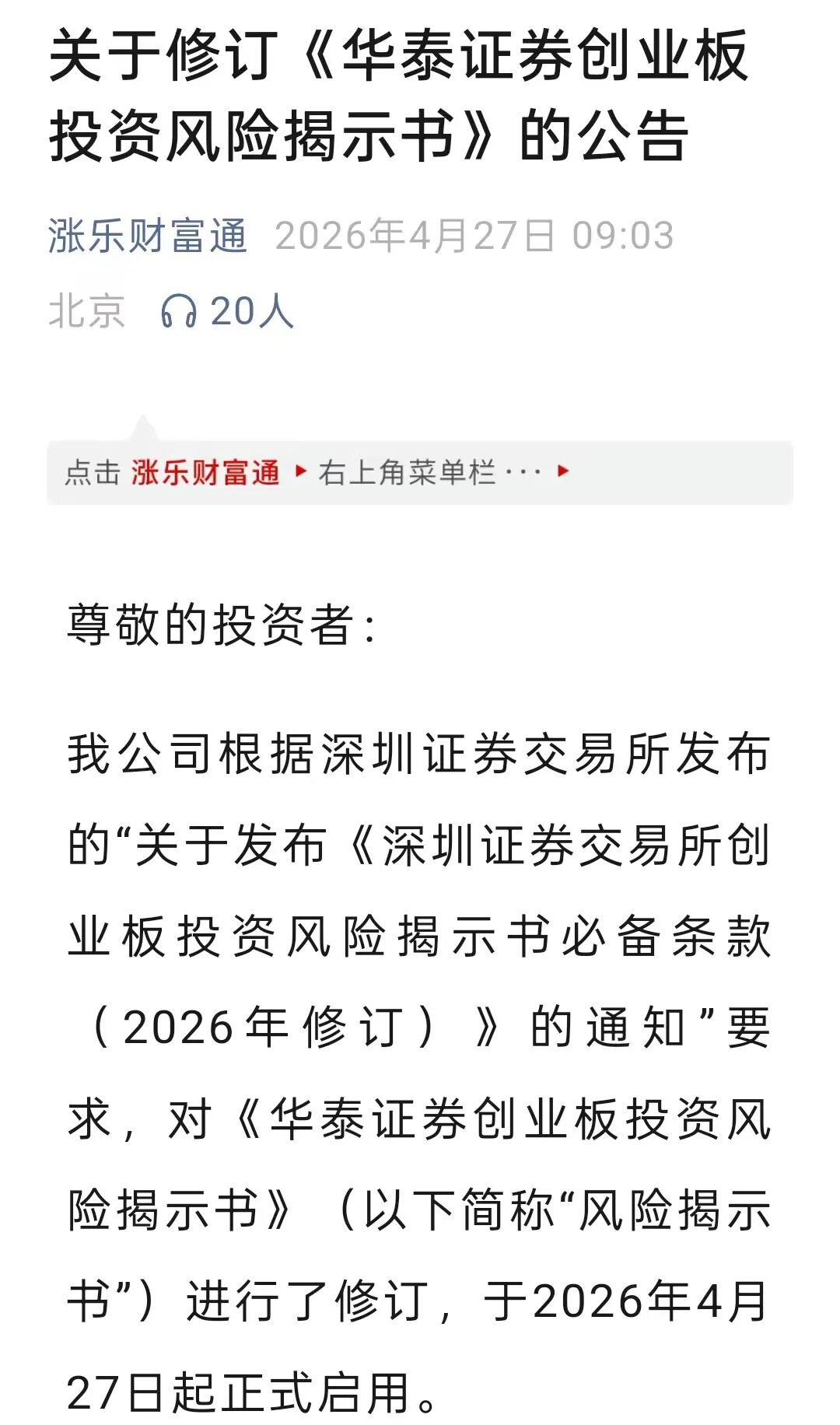随着深交所正式发布深化创业板改革首批配套业务规则,4月27日,包括华泰证券、国泰海通证券、中国银河证券等40多家券商陆续发布公告称,根据深交所发布的“关于发布《深圳证券交易所创业板投资风险揭示书必备条款(2026年修订)》的通知”要求,对《创业板投资风险揭示书》进行了修订,自4月27日起正式启用。