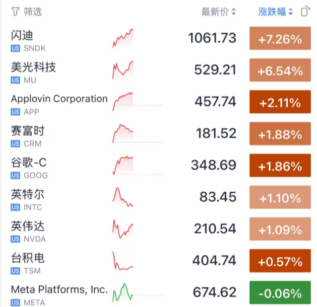 科技股走势分化,存储芯片板块大涨,闪迪、美光科技均大涨超6%,创历史新高。
