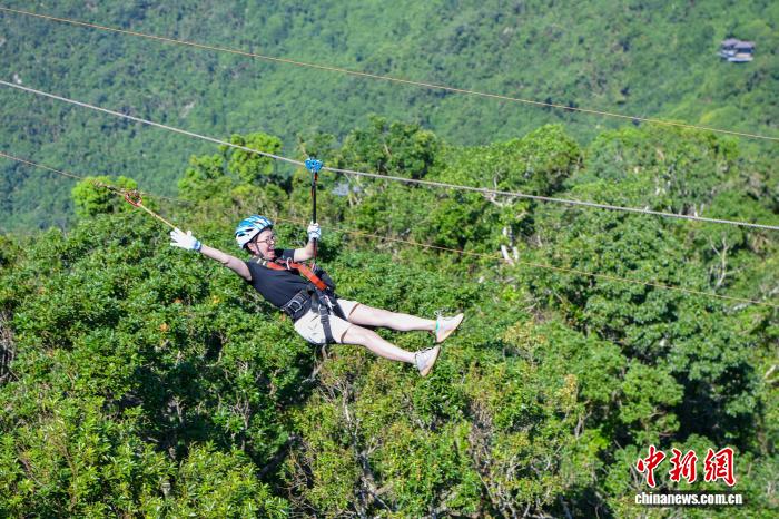 2025年11月14日,在海南三亚亚龙湾热带天堂森林旅游区,游客体验滑索。中新网记者骆云飞摄