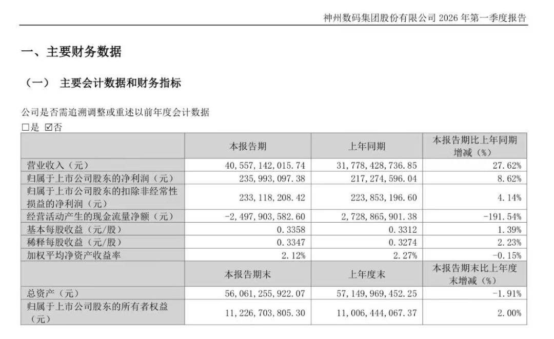 4月27日晚间,神州数码集团(000034.SZ)发布2026年第一季度经营业绩。报告期内,神州数码整体营业收入实现405.6亿元,同比增长27.6%;归母净利实现2.4亿元,同比增长8.6%,毛利额同比增长15.3%;其中,AI相关业务收入实现约155亿元,同比大幅增长119%。