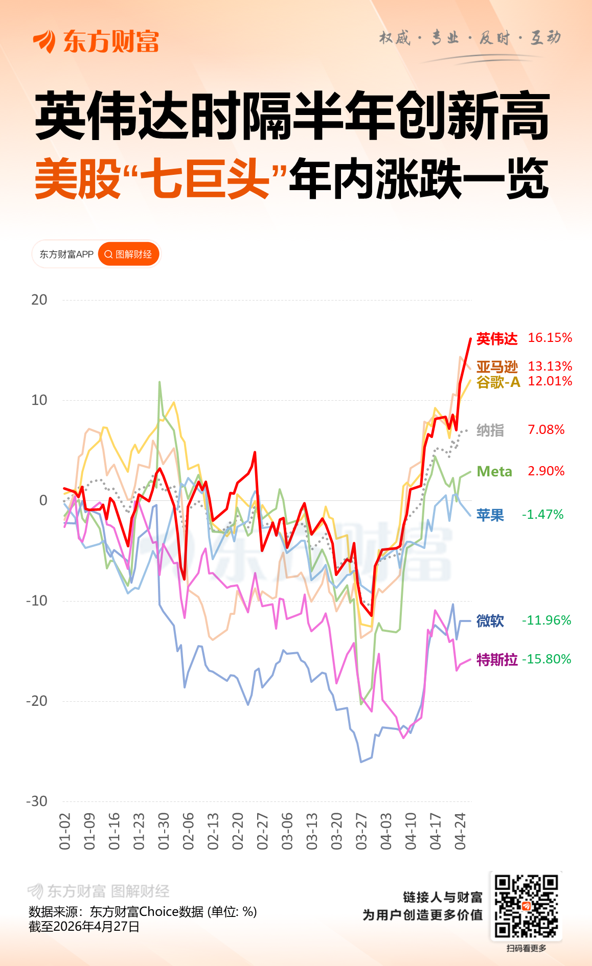 大型科技股多数上涨,Wind美国科技七巨头指数涨0.97%。个股方面,英伟达大涨4%,谷歌涨超1%,双双创出历史新高;微软、Meta、特斯拉小幅收涨;苹果、亚马逊、博通跌超1%。