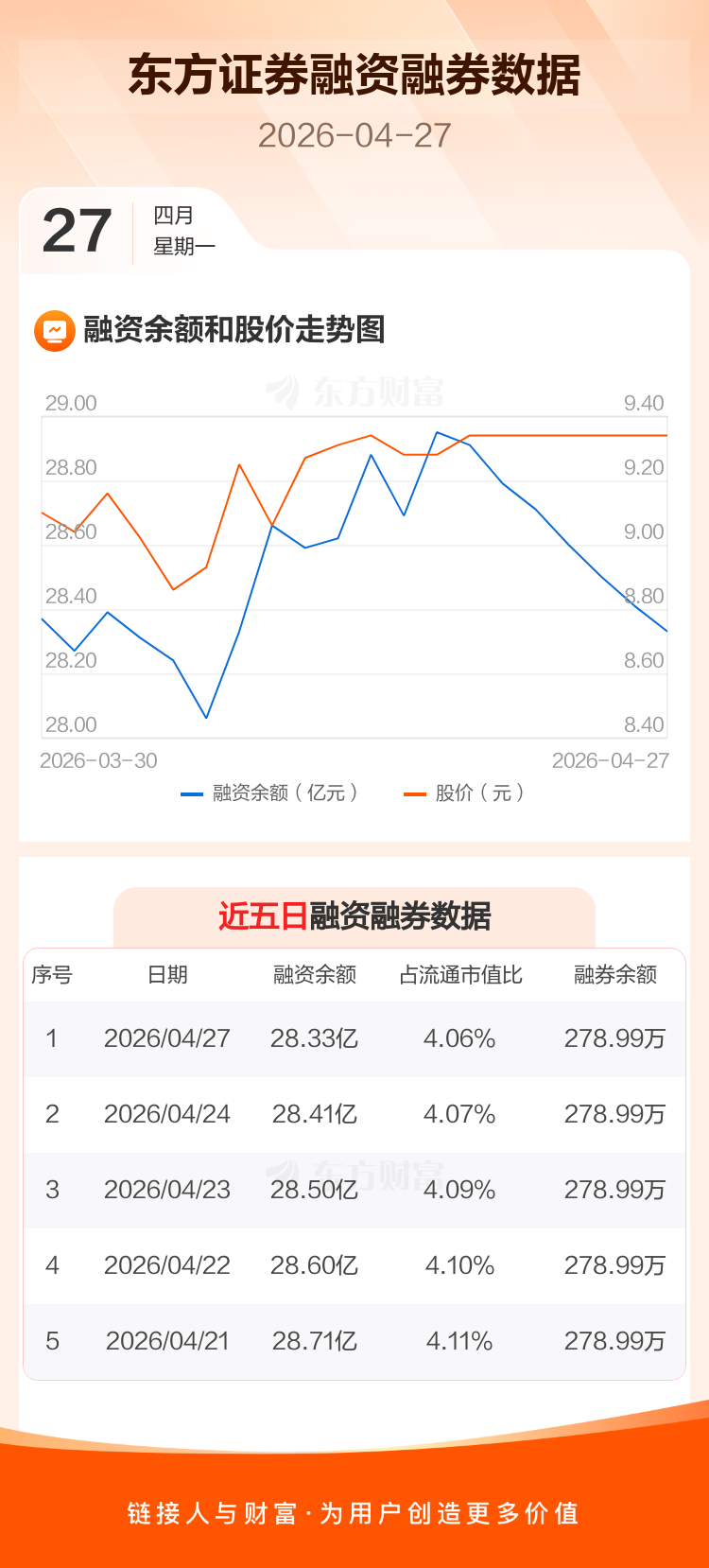 交易所最新数据显示,东方证券于2026年4月27日获融资买入0元,融资偿还752.35万元,当日融资净偿还752.35万元。目前,该股融资余额28.33亿,占流通市值比例为4.06%。