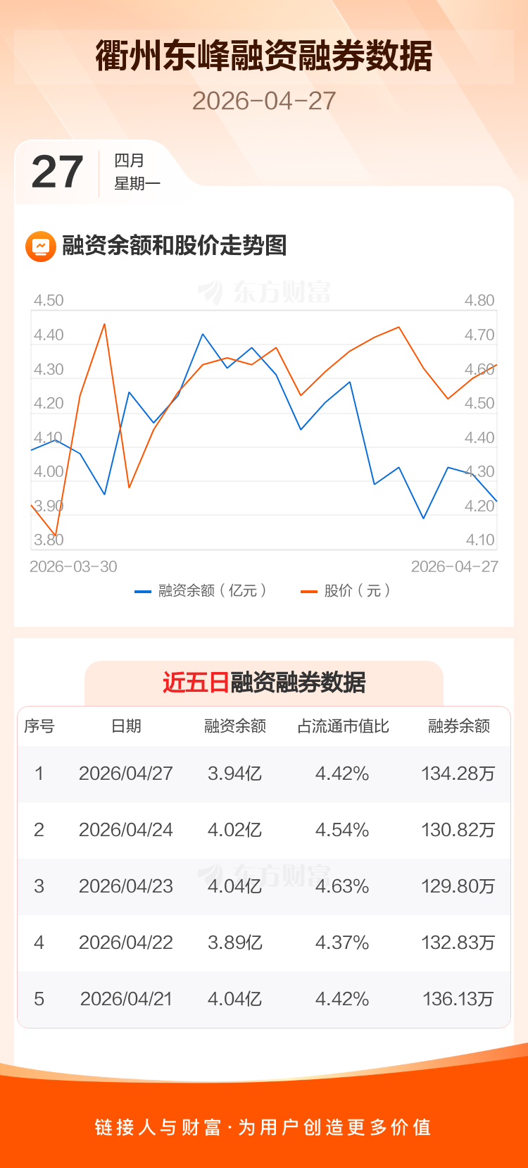 交易所最新数据显示,衢州东峰于2026年4月27日获融资买入1727.55万元,融资偿还2464.82万元,当日融资净偿还737.27万元。目前,该股融资余额3.94亿,占流通市值比例为4.42%。