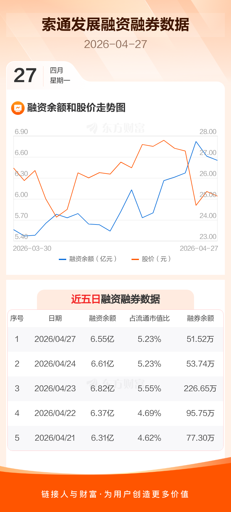 交易所最新数据显示,索通发展于2026年4月27日获融资买入2543.98万元,融资偿还3131.79万元,当日融资净偿还587.81万元。目前,该股融资余额6.55亿,占流通市值比例为5.23%。