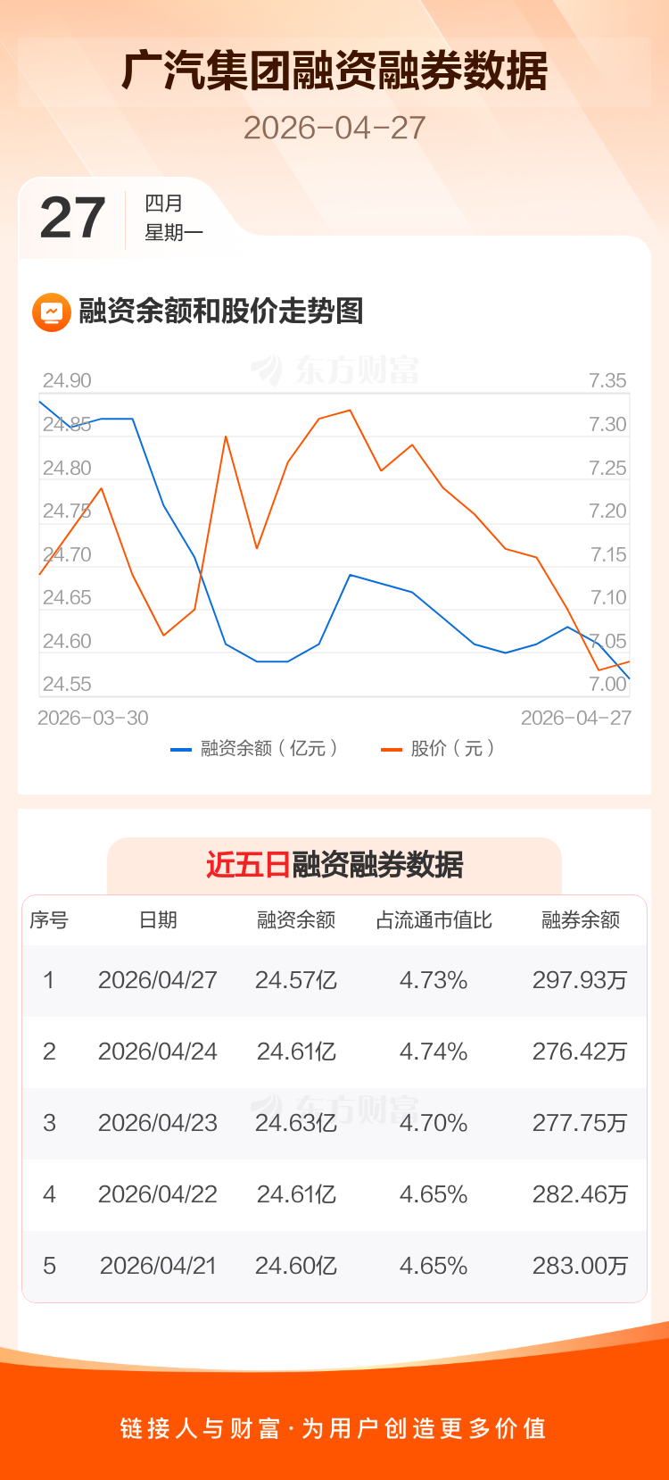 交易所最新数据显示,广汽集团于2026年4月27日获融资买入1312.35万元,融资偿还1641.14万元,当日融资净偿还328.8万元。目前,该股融资余额24.57亿,占流通市值比例为4.73%。