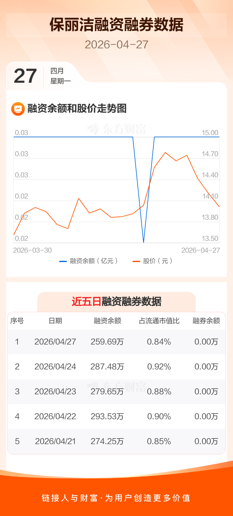 交易所最新数据显示,保丽洁于2026年4月27日获融资买入24.34万元,融资偿还52.13万元,当日融资净偿还27.79万元。目前,该股融资余额259.69万,占流通市值比例为0.84%。