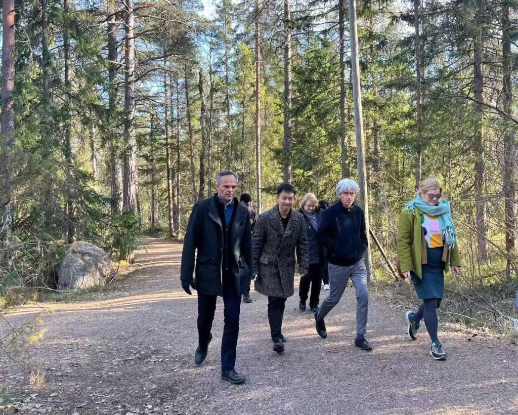 埃斯波市市长凯·米凯宁(Kai Mykknen)与记者在Nuuksio国家公园漫步。