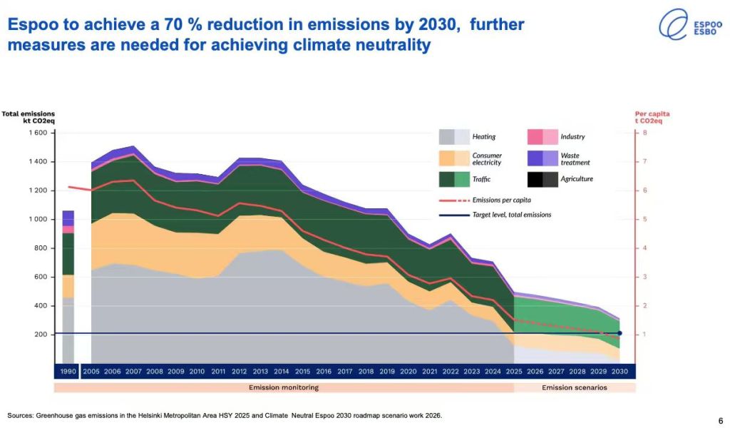 1990年以来芬兰埃斯波市温室气体排放总体持续下降;按当前情景,到2030年可实现约70%减排,但距气候中和仍需进一步措施。