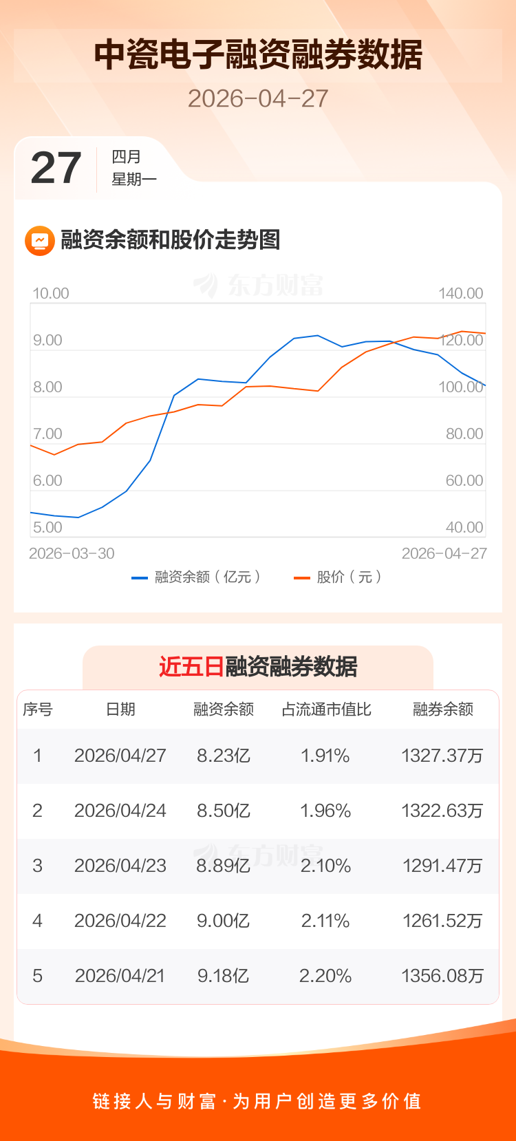 交易所最新数据显示,中瓷电子于2026年4月27日获融资买入1.45亿元,融资偿还1.72亿元,当日融资净偿还2740.13万元。目前,该股融资余额8.23亿,占流通市值比例为1.91%。