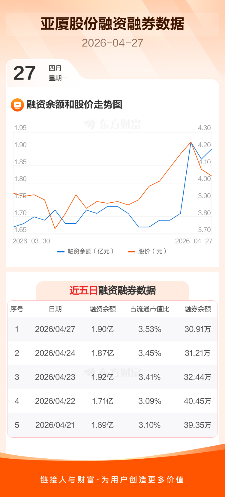 交易所最新数据显示,亚厦股份于2026年4月27日获融资买入967.04万元,融资偿还738.04万元,当日融资净买入229万元。目前,该股融资余额1.90亿,占流通市值比例为3.53%。