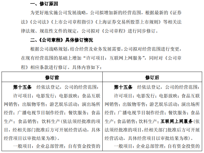 同日,横店影视发布拟变更经营范围及修订《公司章程》的公告称,根据公司战略规划,结合经营及业务发展需要,公司拟对经营范围进行变更,在现有经营范围的基础上增加“许可项目:互联网上网服务”,同时对《公司章程》相应条款进行修订。