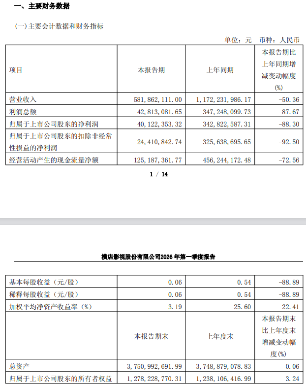 2026年第一季度,横店影视实现营业收入5.82亿元,同比下降50.36%;归属于上市公司股东的净利润4012.24万元,同比下降88.30%;归属于上市公司股东的扣除非经常性损益的净利润2441.08万元,同比下降92.50%。