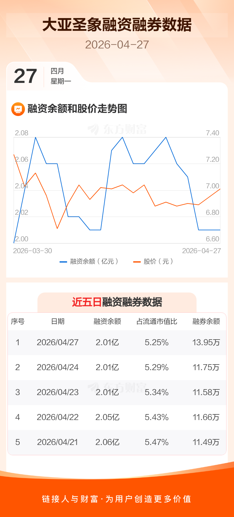 交易所最新数据显示,大亚圣象于2026年4月27日获融资买入284.63万元,融资偿还246.57万元,当日融资净买入38.05万元。目前,该股融资余额2.01亿,占流通市值比例为5.25%。