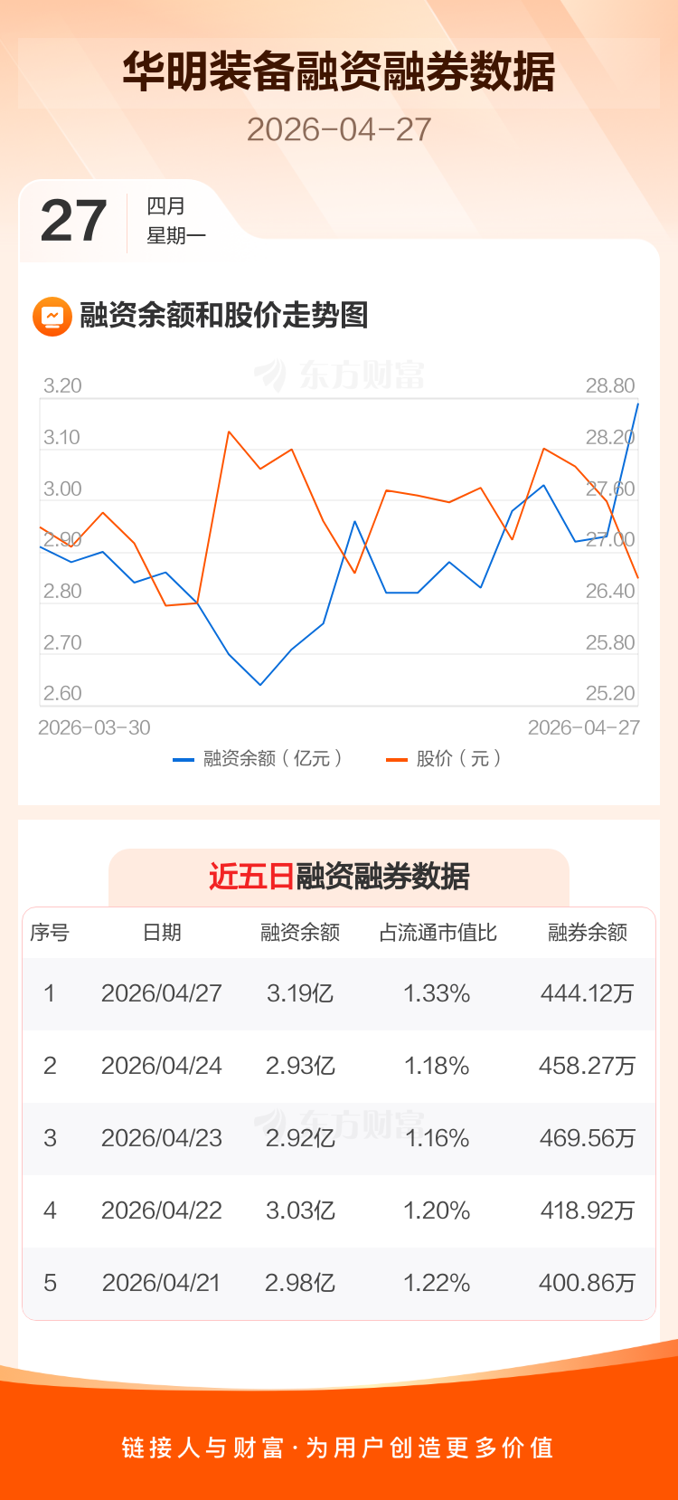 交易所最新数据显示,华明装备于2026年4月27日获融资买入5492.22万元,融资偿还2888.58万元,当日融资净买入2603.64万元。目前,该股融资余额3.19亿,占流通市值比例为1.33%。