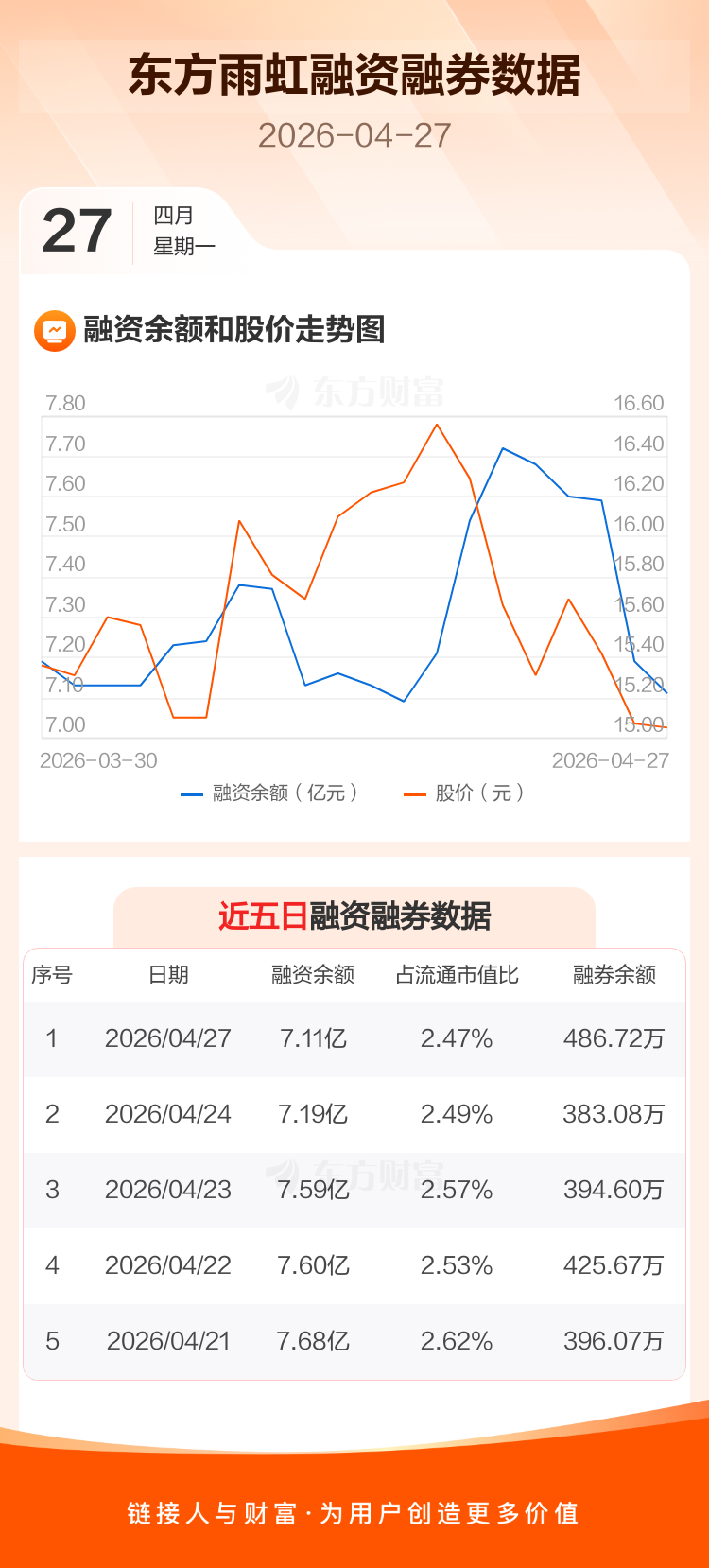 交易所最新数据显示,东方雨虹于2026年4月27日获融资买入2407.53万元,融资偿还3225.89万元,当日融资净偿还818.37万元。目前,该股融资余额7.11亿,占流通市值比例为2.47%。