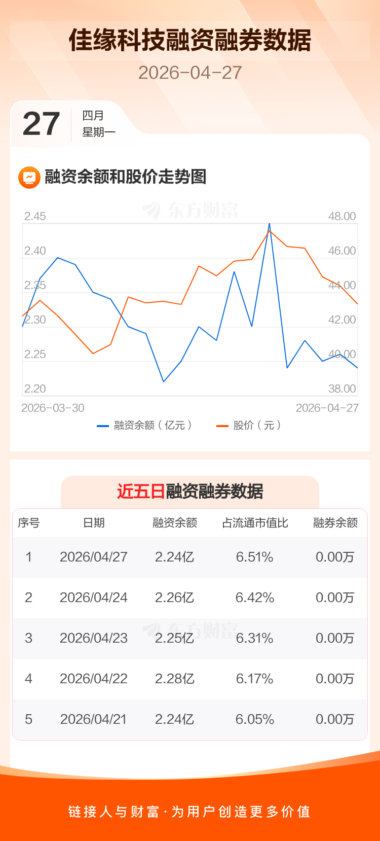 交易所最新数据显示,佳缘科技于2026年4月27日获融资买入1497.94万元,融资偿还1744.81万元,当日融资净偿还246.87万元。目前,该股融资余额2.24亿,占流通市值比例为6.51%。