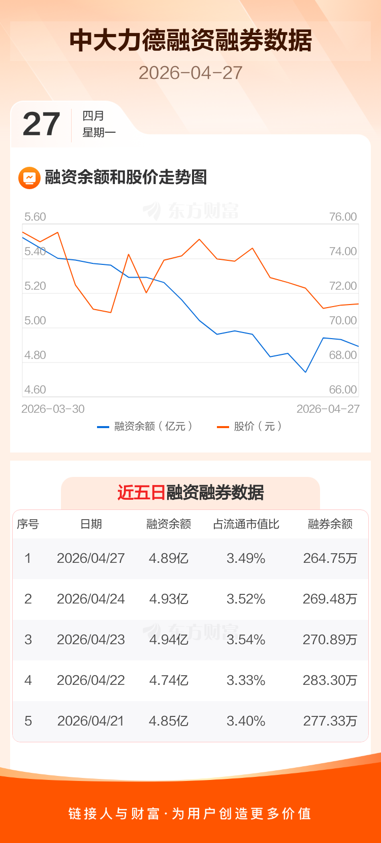 交易所最新数据显示,中大力德于2026年4月27日获融资买入1470.73万元,融资偿还1832.91万元,当日融资净偿还362.18万元。目前,该股融资余额4.89亿,占流通市值比例为3.49%。