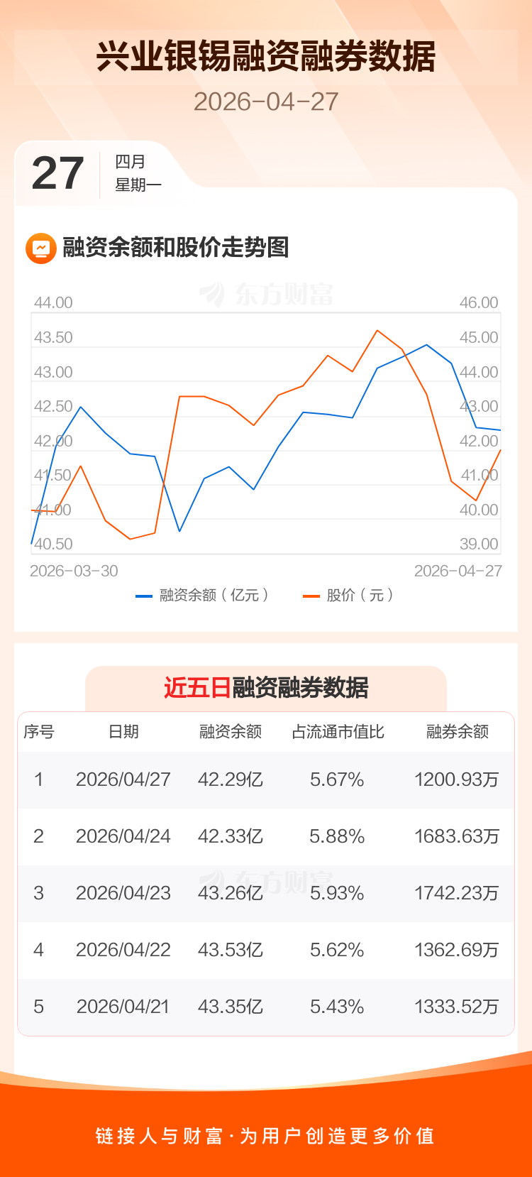交易所最新数据显示,兴业银锡于2026年4月27日获融资买入2.69亿元,融资偿还2.73亿元,当日融资净偿还448.8万元。目前,该股融资余额42.29亿,占流通市值比例为5.67%。