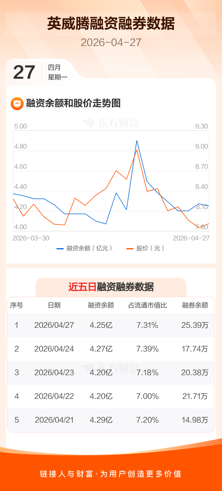 交易所最新数据显示,英威腾于2026年4月27日获融资买入1406.21万元,融资偿还1555.71万元,当日融资净偿还149.5万元。目前,该股融资余额4.25亿,占流通市值比例为7.31%。