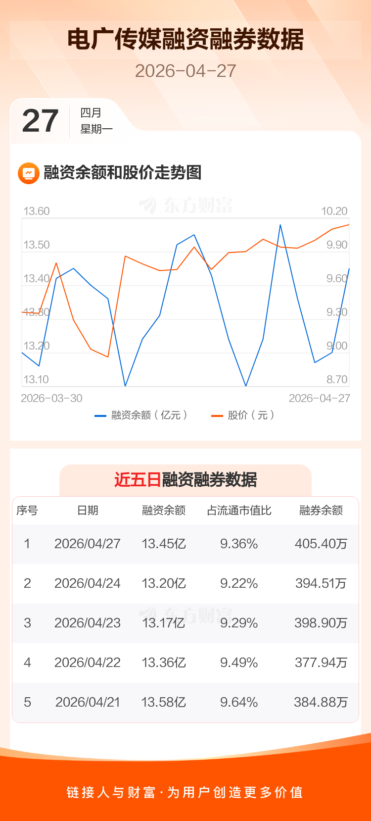 交易所最新数据显示,电广传媒于2026年4月27日获融资买入5561.48万元,融资偿还3052.68万元,当日融资净买入2508.8万元。目前,该股融资余额13.45亿,占流通市值比例为9.36%。