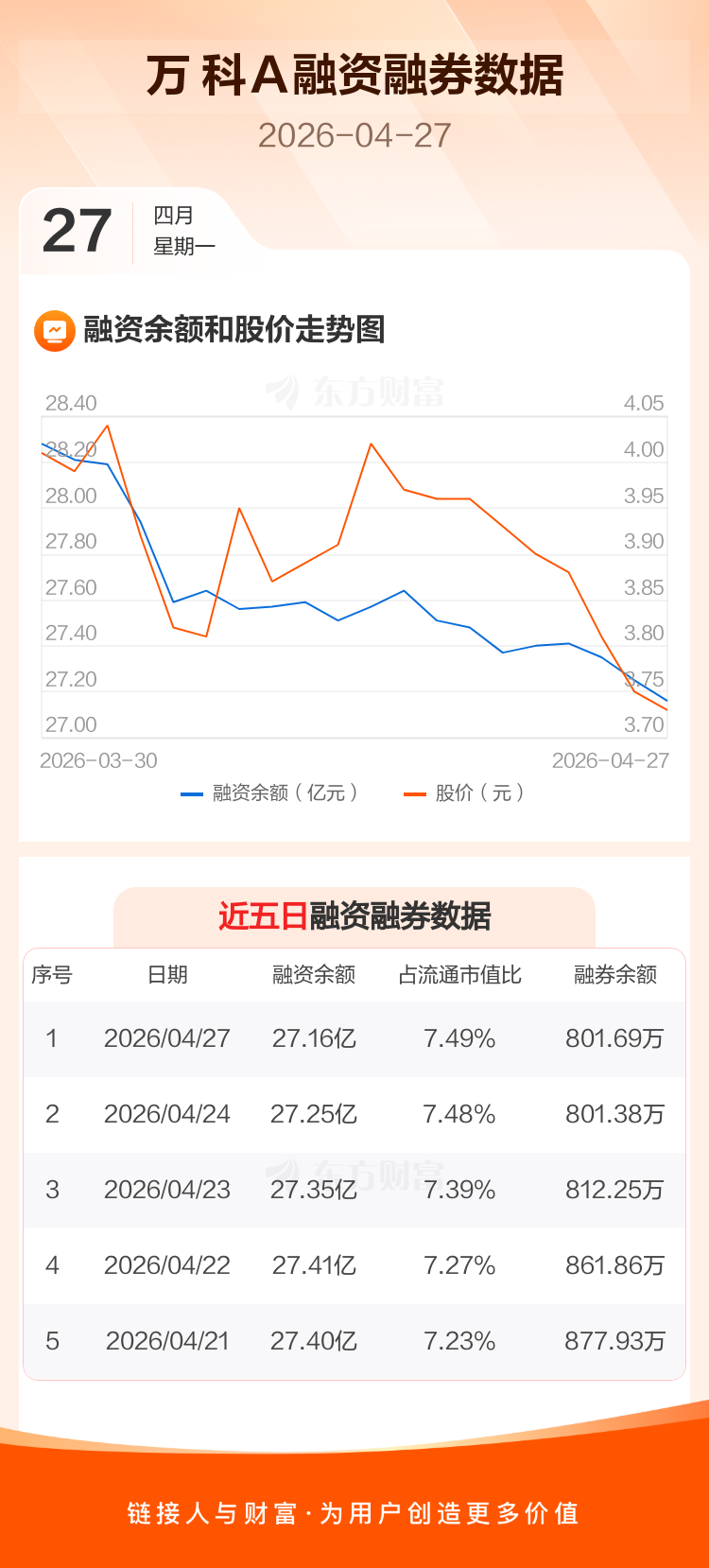 交易所最新数据显示,万 科A于2026年4月27日获融资买入2485.52万元,融资偿还3367.63万元,当日融资净偿还882.1万元。目前,该股融资余额27.16亿,占流通市值比例为7.49%。
