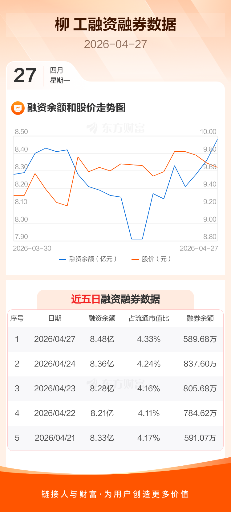 交易所最新数据显示,柳 工于2026年4月27日获融资买入4317.32万元,融资偿还3108.82万元,当日融资净买入1208.5万元。目前,该股融资余额8.48亿,占流通市值比例为4.33%。