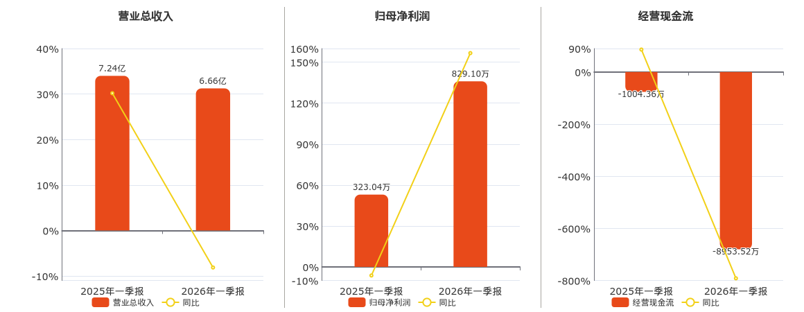 公司营业总收入为6.66亿元,较去年同报告期营业总收入减少5886.89万元,同比较去年同期下降8.13%。归母净利润为829.10万元,在已披露的同业公司中排名第29。经营活动现金净流入为-8953.52万元,在已披露的同业公司中排名第35,较去年同报告期经营活动现金净流入减少7949.16万元。