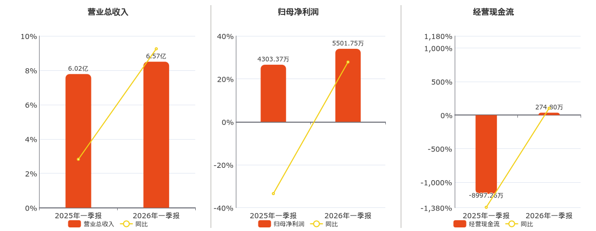 公司营业总收入为6.57亿元。归母净利润为5501.75万元。经营活动现金净流入为274.80万元。