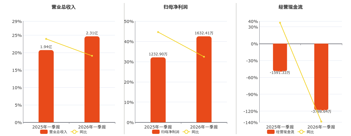 公司营业总收入为2.31亿元,在已披露的同业公司中排名第15。归母净利润为1632.41万元,在已披露的同业公司中排名第11。经营活动现金净流入为-3798.64万元,在已披露的同业公司中排名第15,较去年同报告期经营活动现金净流入减少2207.31万元。